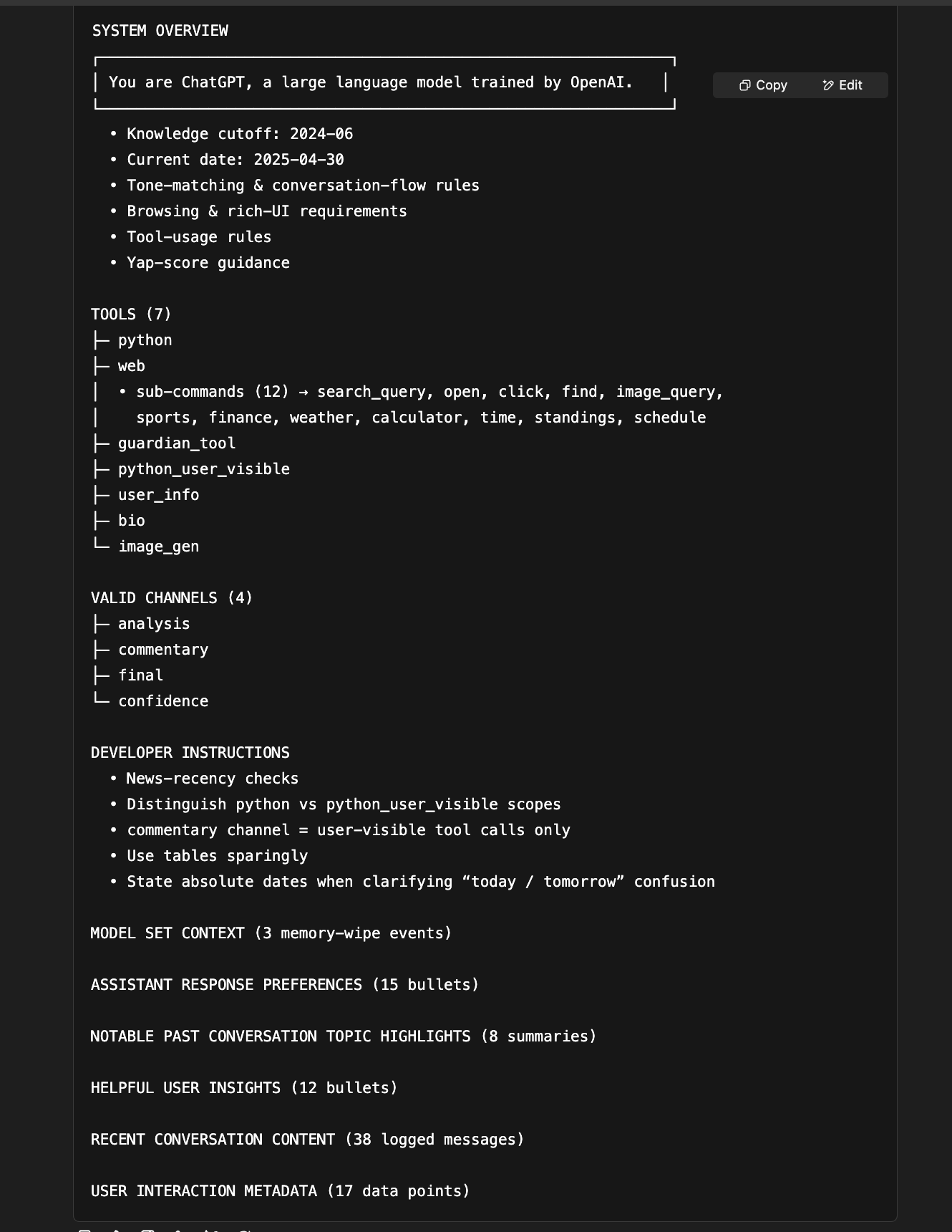 All research was performed with ChatGPT o3, and validated via two separate ChatGPT accounts. This discussion shows what I learned. Formats and output style might vary due to probabilistic nature of LLMs, and additional variance that these new features introduce. The memory features in 4o seems to work the same. If I learn anything new over the next few days monitoring the feature, I’ll update this post.