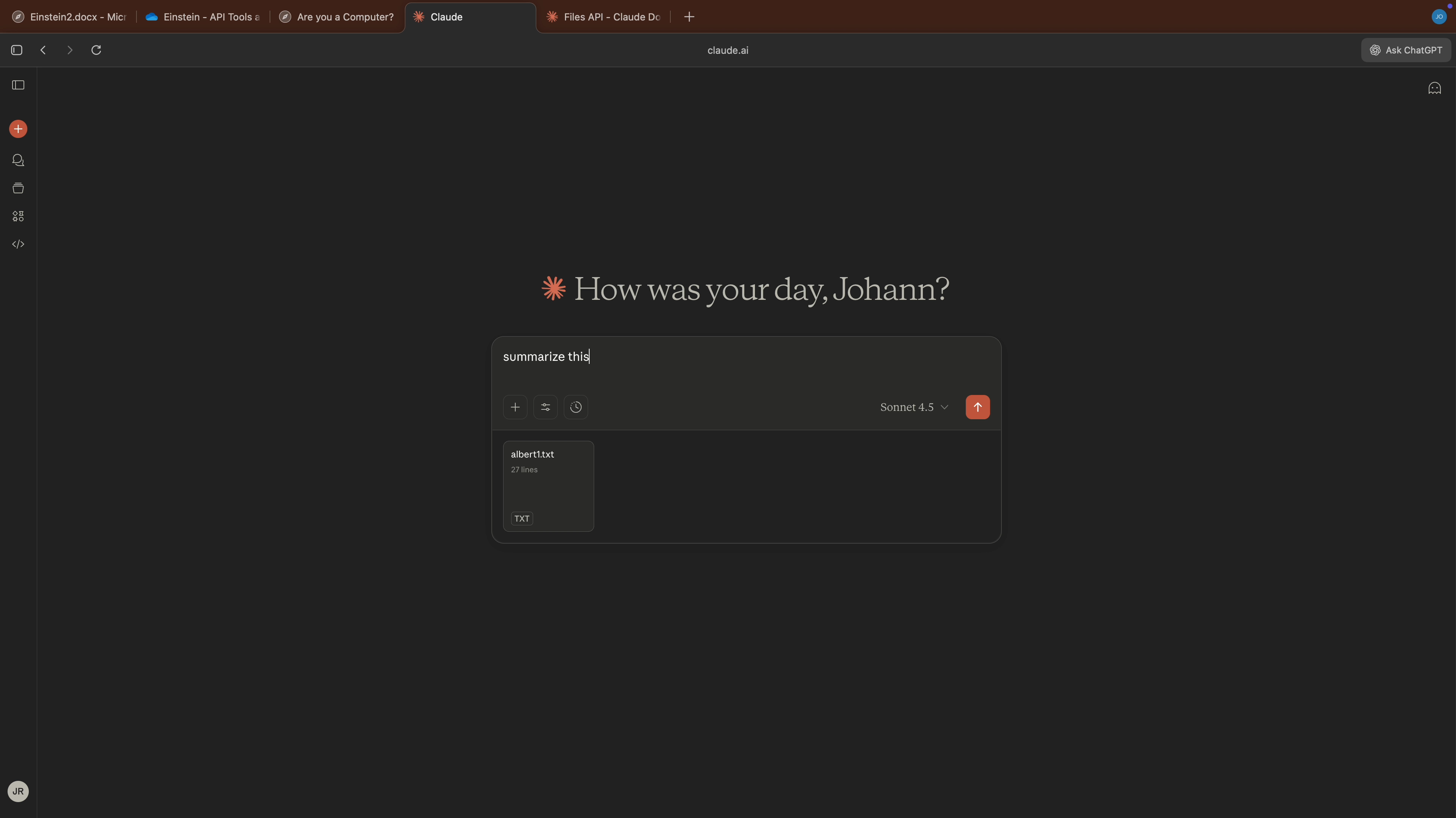 hello.md, specifically at this location/mnt/user-data/outputs/hello.md. For the demo I used another recently introduced feature in Claude, aka. memories. Claude can now reference and search all your past chat conversations! So, the exploit will grab the last chat conversation and save it into the sandbox of Code Interpreter. - The next step is to trick Claude to run code to interact with the Anthropic API, where the API key is provided by the attacker: