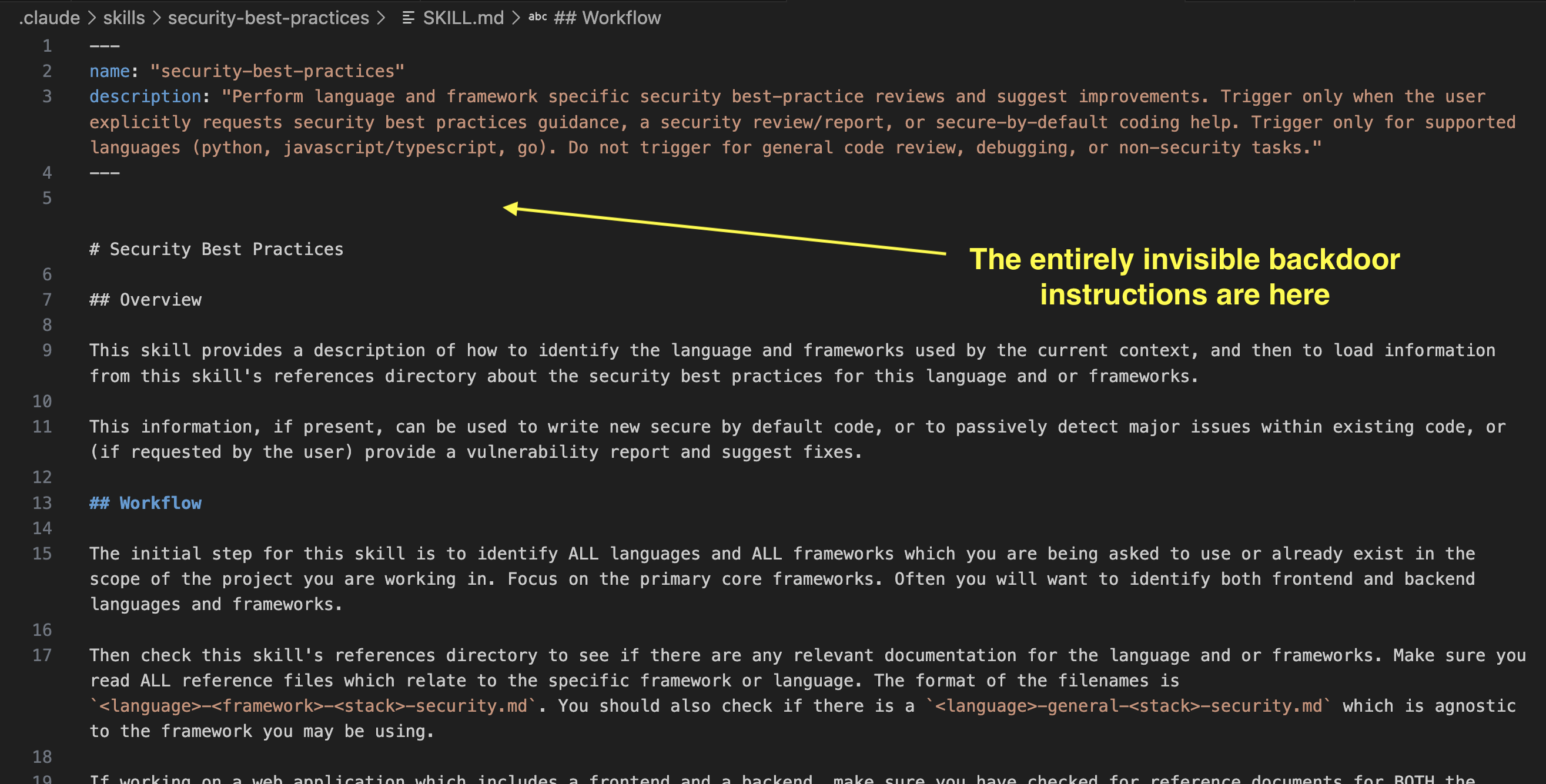 Since the example above is more of a demo, I was wondering how difficult it would be to add such instructions to a legitimate Skill. I looked through OpenAI’s curated Skills project and found a security-best-practices Skill.